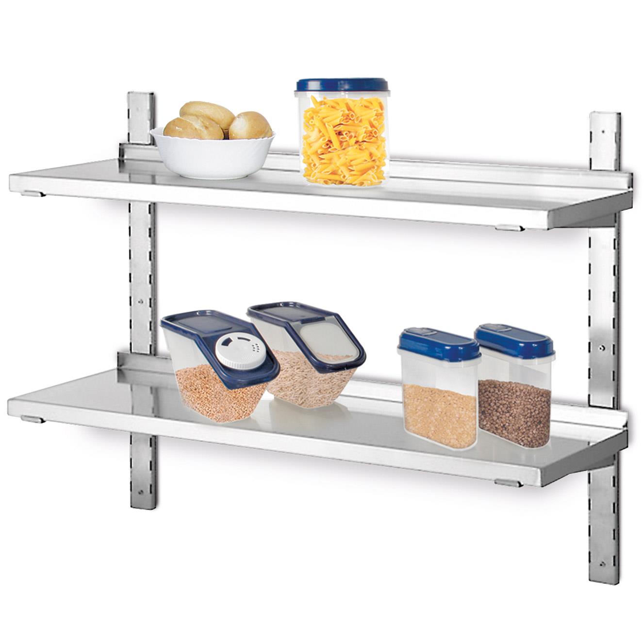Stabiles, rostfreies Edelstahl-Wandregal mit 2 Böden zum Einhängen. Ideal für Gastronomie, Hotellerie, Restaurants, Imbiss, etc. Böden 30 mm hoch, an der Wandseite mit 29 mm hoher Aufkantung. Das Edelstahlregal bietet eine optimale Lagerungsmöglichkeit durch flexible Höhenverstellbarkeit im Raster von 42 mm. Die Böden werden in die Konsolen eingehängt. Tragkraft 20 kg je Boden.